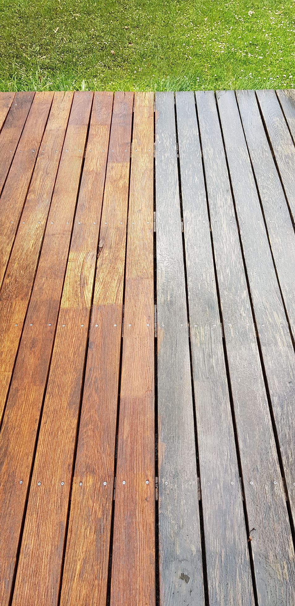 Leider ist unser mitteleuropäisches ,,feuchte‘‘ Wetter nicht grade zimperlich mit Ihrem Terrassenboden. Er ergraut trotz liebevoller Behandlung viel zu schnell. Moos, Blätter, Gras und Regen erledigen ihr übriges und setzen dem Holz zu.